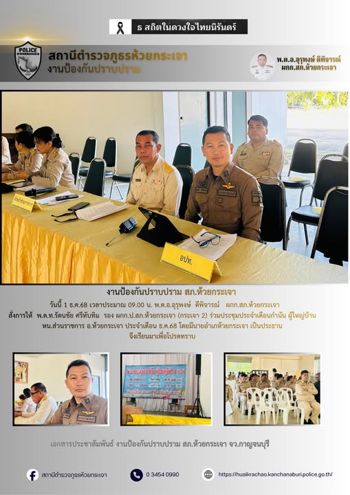 วันที่ 1 ธ.ค.68 เวลา 09.00 น. พ.ต.อ.อุรุพงษ์ ดีพิจารณ์ ผกก.สภ.ห้วยกระเจา มอบหมายให้ พ.ต.ท.รัตนชัย ศรีทับทิม รอง ผกก.ป.สภ.ห้วยกระเจา ร่วมประชุมกำนันผู้ใหญ่บ้านฯประจำเดือน ธ.ค.68 ณ หอประชุม อ.ห้วยกระเจา จว.กาญจนบุรี