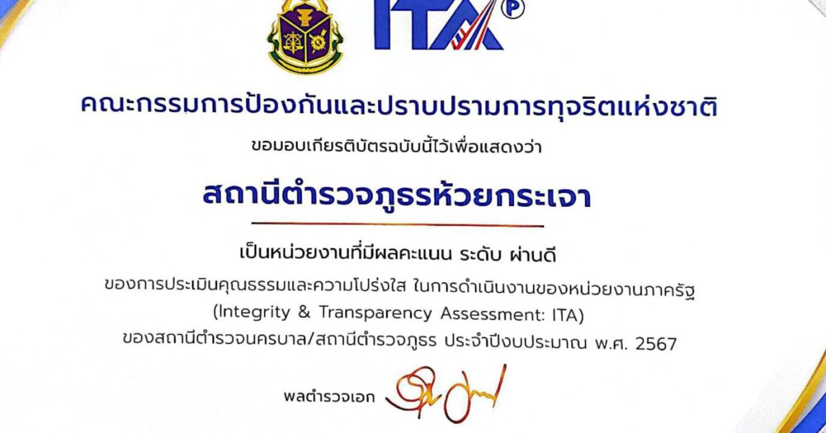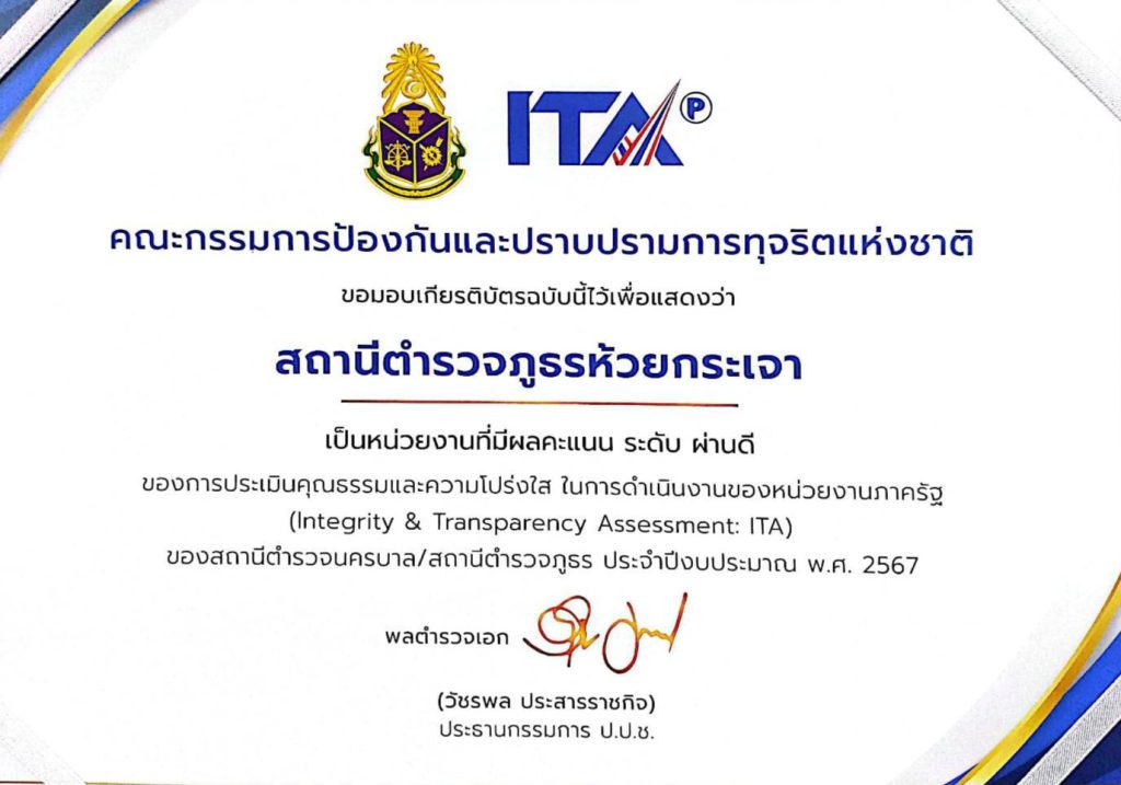 คณะกรรมการป้องกันและปราบปรามการทุจริตแห่งชาติ มอบเกียรติบัตร สถานีตํารวจภูธรห้วยกระเจา เป็นหน่วยงานที่มีผลคะแนน ระดับ “ผ่านดี” ของการประเมินคุณธรรมและความโปร่งใส ในการดําเนินงานของหน่วยงานภาครัฐ (Integrity & Transparency Assessment: ITA) ของสถานีตํารวจนครบาล/สถานีตํารวจภูธร ประจําปีงบประมาณ พ.ศ. 2567