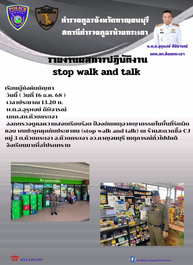 วันที่ 16 ธ.ค. 68 เวลาประมาณ 13.20 น. พ.ต.อ.อุรุพงษ์ ดีพิจารณ์ ผกก.สภ.ห้วยกระเจา ออกตรวจดูแลความสงบเรียบร้อย ป้องกันเหตุอาชญากรรมในพื้นที่รับผิดชอบ พบปะพูดคุยกับประชาชน (stop walk and talk) ณ ร้านสะดวกซื้อ CJ หมู่ 3 ต.ห้วยกระเจา อ.ห้วยกระเจา จว.ภาญจนบุรี