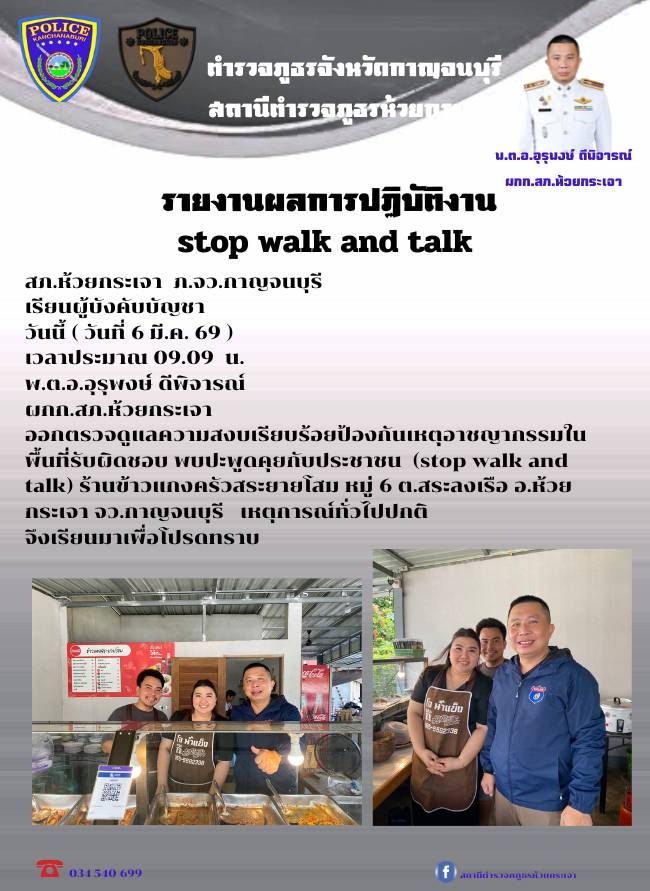 วันที่ 6 มี.ค. 69 เวลาประมาณ 09.09 น. พ.ต.อ.อุรุพงษ์ ดีพิจารณ์ ผกก.สภ.ห้วยกระเจา ออกตรวจดูแลความสงบเรียบร้อยป้องกันเหตุอาชญากรรมในพื้นที่รับผิดชอบ พบปะพูดคุยกับประชาชน (stop walk and talk) ร้านข้าวแกงครัวสระยายโสม หมู่ 6 ต.สระลงเรือ อ.ห้วยกระเจา จว.กาญจนบุรี