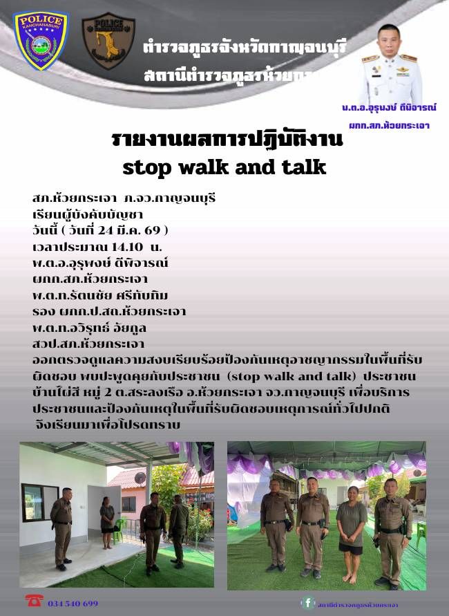 วันที่ 24 มี.ค. 69 เวลาประมาณ 14.10 น. พ.ต.อ.อุรุพงษ์ ดีพิจารณ์ ผกก.สภ.ห้วยกระเจา พ.ต.ท.รัตนชัย ศรีทับทิม รอง ผกก.ป.สถ.ห้วยกระเจา พ.ต.ท.อวิรุทธ์ อัยกูล สวป.สภ.ห้วยกระเจา ออกตรวจดูแลความสงบเรียบร้อยป้องกันเหตุอาชญากรรมในพื้นที่รับผิดชอบ พบปะพูดคุยกับประชาชน (stop walk and talk) บ้านไผ่สี หมู่ 2 ต.สระลงเรือ อ.ห้วยกระเจา จว.กาญจนบุรี เพื่อบริการประชาชนและป้องกันเหตุในพื้นที่รับผิดชอบ
