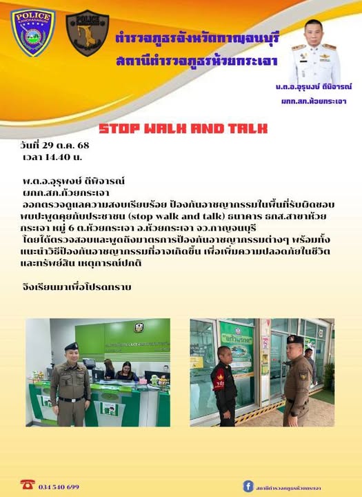 พ.ต.อ.อุรุพงษ์ ดีพิจารณ์ ผกก สภ.ห้วยกระเจา ออกตรวจพบปะพูดคุยกับประชาชน “stop walk and talk” บริเวณธนาคารธกส.ในเขตเทศบาล ต.ห้วยกระเจา อ.ห้วยกระเจา จ.กาญจนบุรี